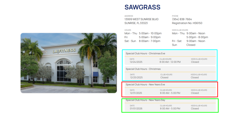 Before committing, check club hours, especially around holidays, many locations close early on Christmas Eve or remain shut on December 25.