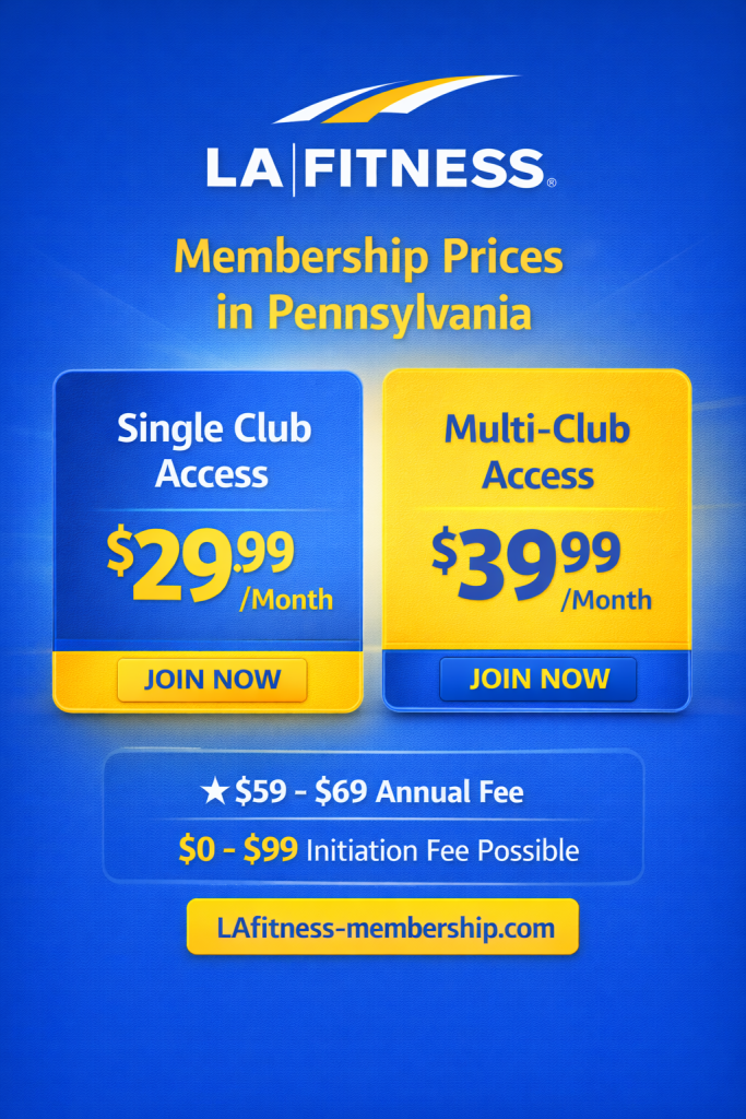 ★ LA Fitness membership prices in Pennsylvania typically start at $39.99 monthly for multi-club access,